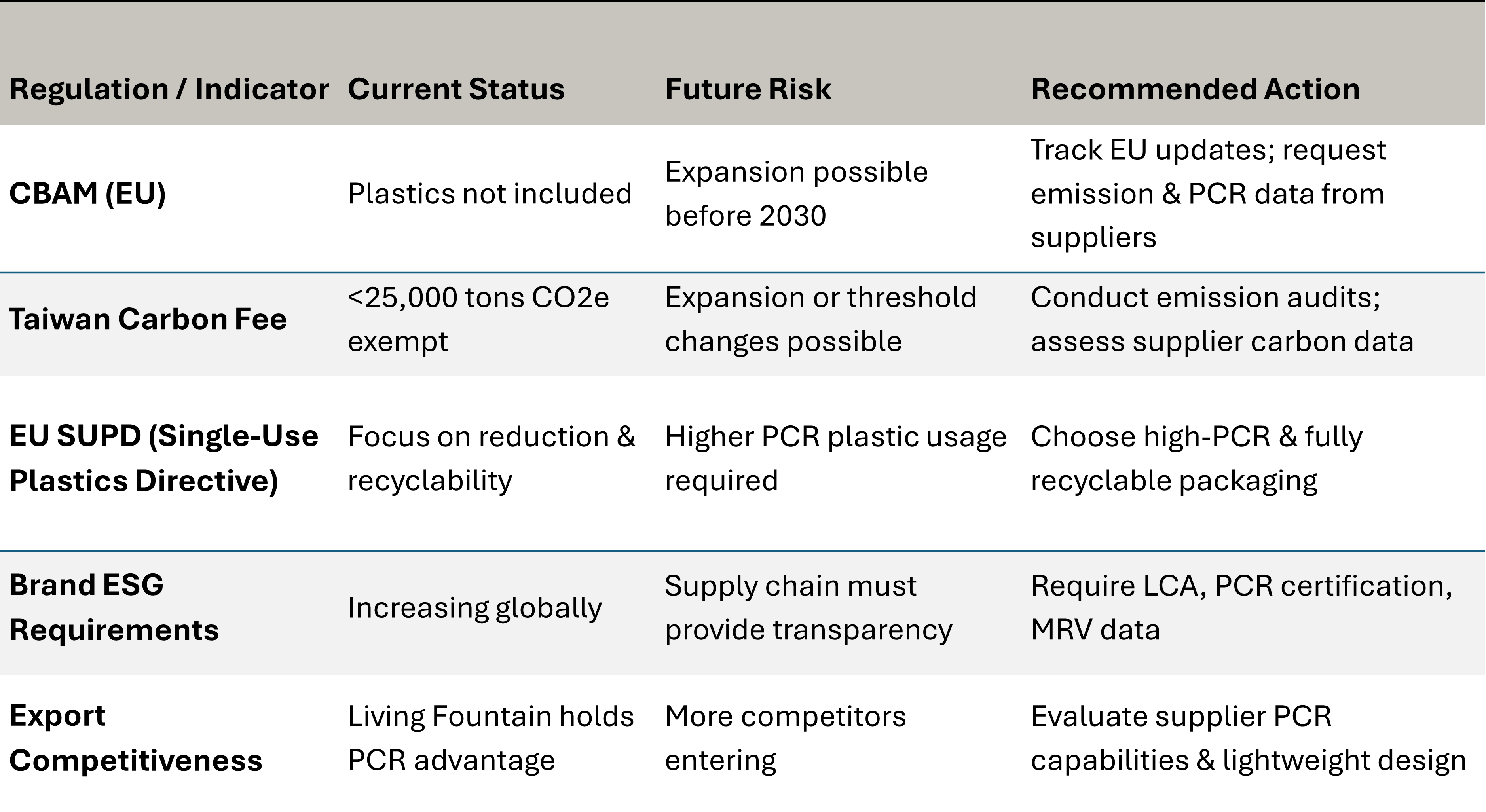 Living Fountain’s PCR solutions help brands proactively comply with CBAM, Taiwan carbon fees, and EU sustainability requirements.