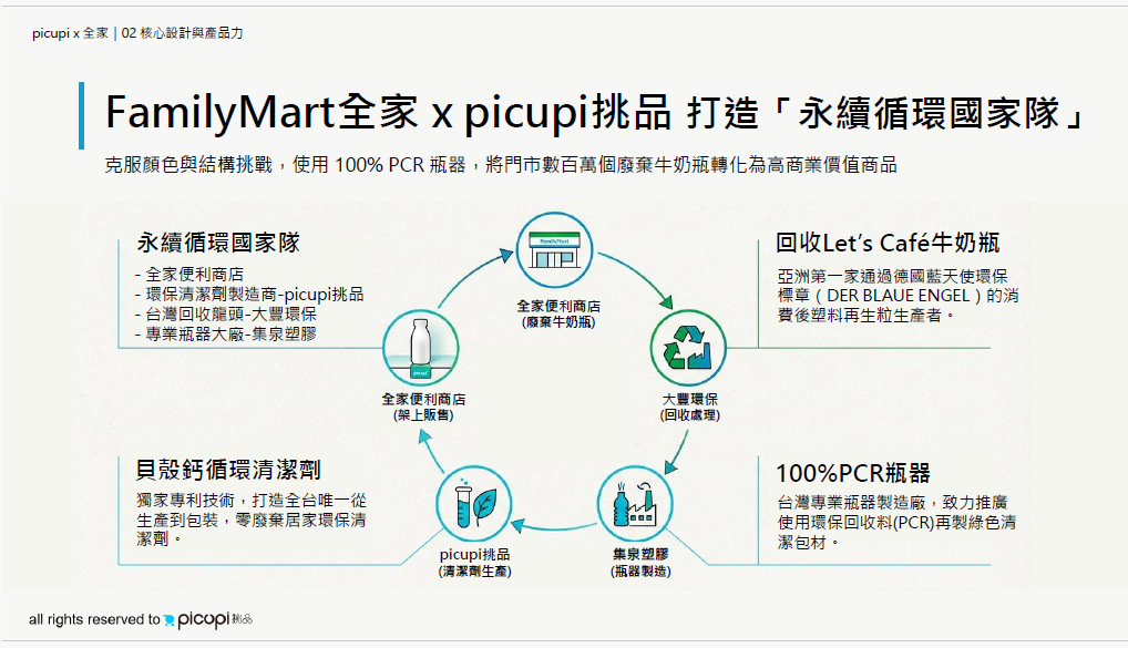 集泉塑膠は資源循環の実現に向け、picupiとファミリーマートが共同で推進する「全チャネル閉ループ型リサイクルプロジェクト」に参画しました。本プロジェクトにおいて、集泉は循環システムの重要な製造パートナーとして、高品質な再生プラスチック(ファミリーマートの業務用牛乳ボトルを大豐環保が回収・再生)を活用し、精密な製造プロセスを通じて100% PCRボトルを製造しています。